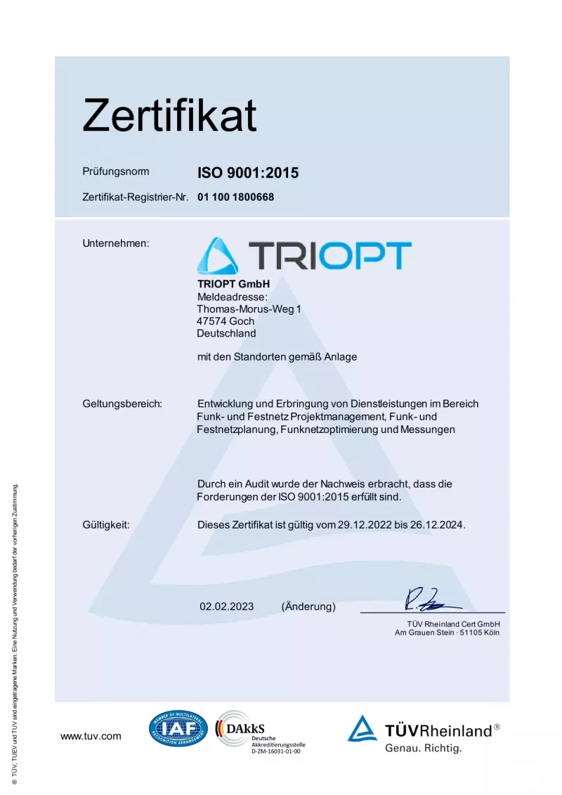 Dank der Zertifizierung stellen wir sicher, dass wir unsere hohen Qualitätsstandards erfüllen und kontinuierlich erstklassige Dienstleistungen anbieten. Unsere Kunden und Partner können auf unsere Expertise vertrauen, da wir über das erforderliche Fachwissen und die Ressourcen verfügen, um komplexe Projekte erfolgreich umzusetzen. Die ISO 9001:2015 Zertifizierung unterstreicht unser Versprechen zur Qualität und kontinuierlichen Verbesserung unserer Arbeit.