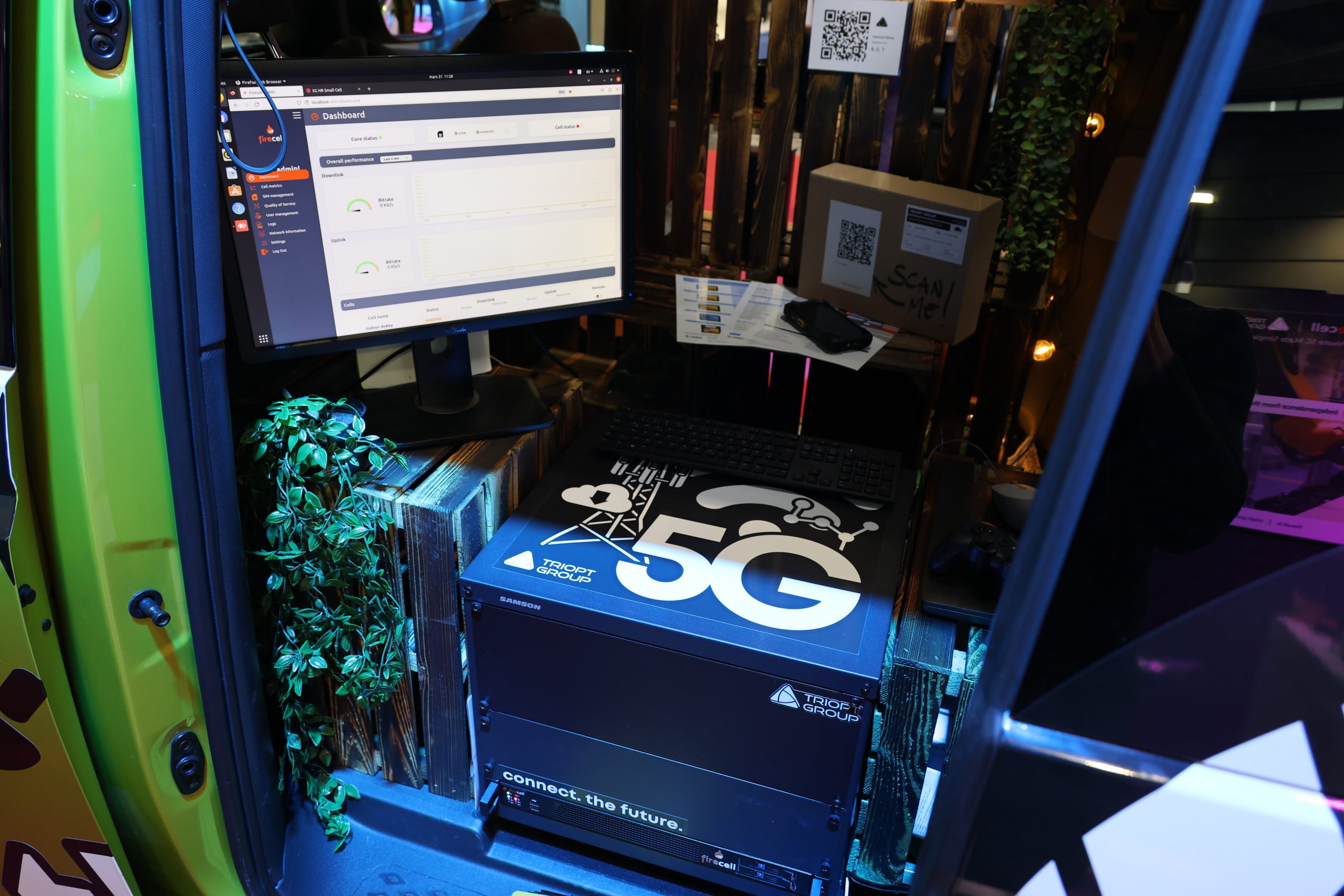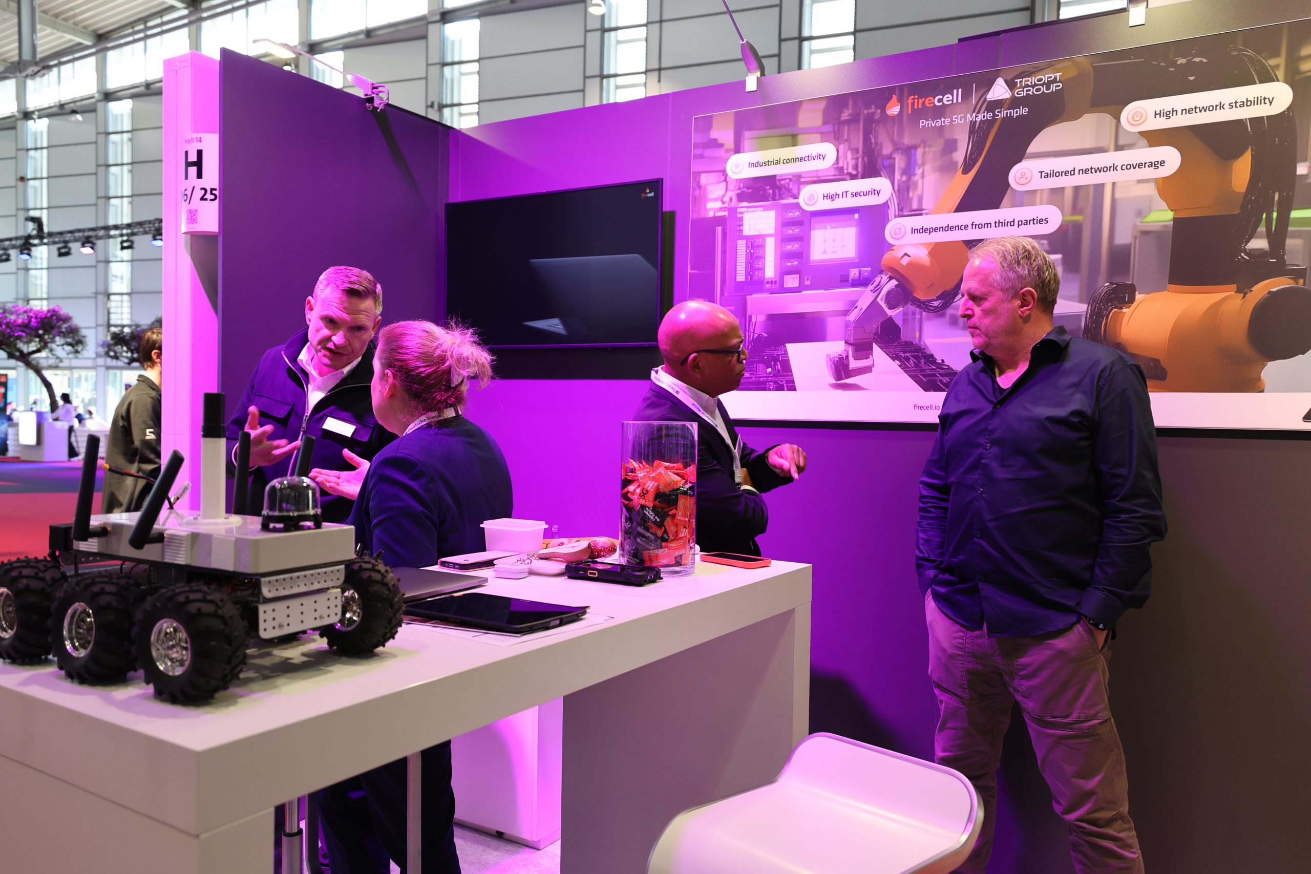 Ein Highlight unseres Messeauftritts war der #Triopt5GBuzz – ein technisch ausgestatteter VW ID.Buzz mit eingebauter mobiler 5G-Antenne und vollständig funktionsfähigem 5G Pop-up Netzwerk. Neben einer einladenden Kaffee-Station und einem Selfie-Gewinnspiel präsentierten wir verschiedene reale Anwendungsszenarien für Private 5G, direkt im Bus. Besonders im Fokus: der Einsatz eines 5G-gesteuerten Rover, die hauseigene Lagersoftware und 5G unterstützende Scanner unseres Partners Zebra – alles live vernetzt über unser eigenes Campus-Netz.